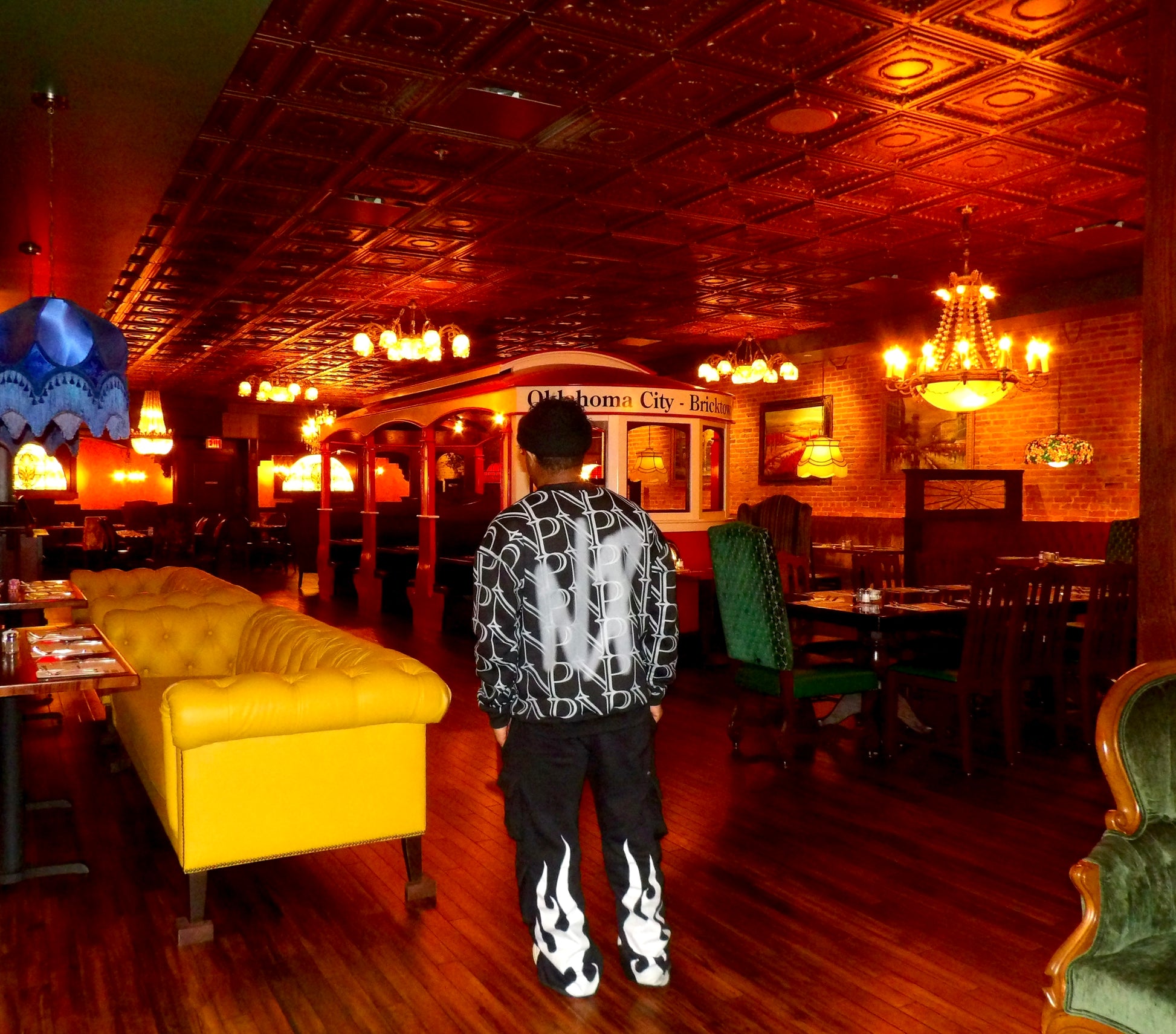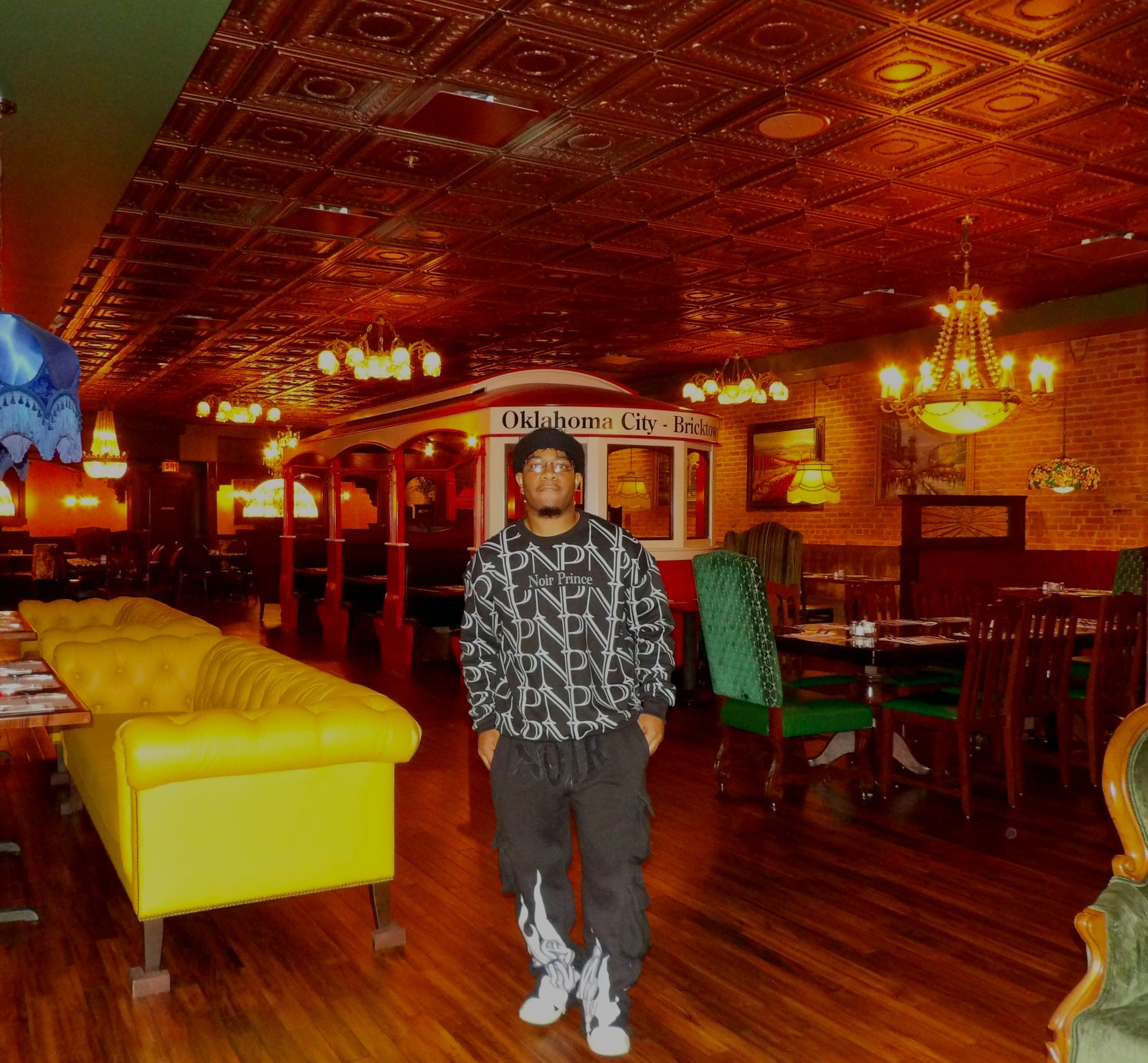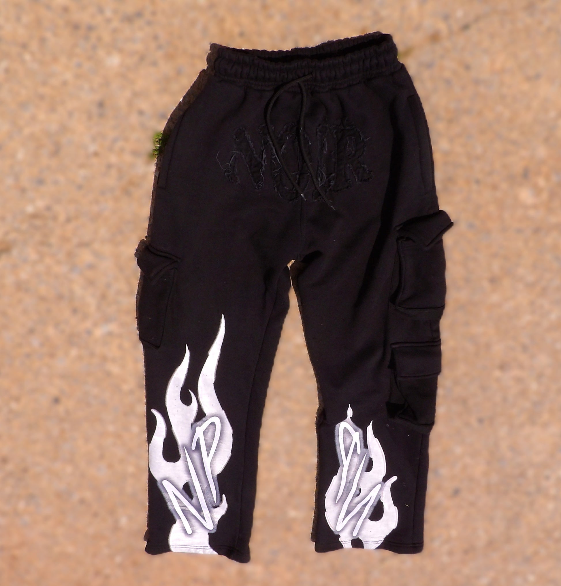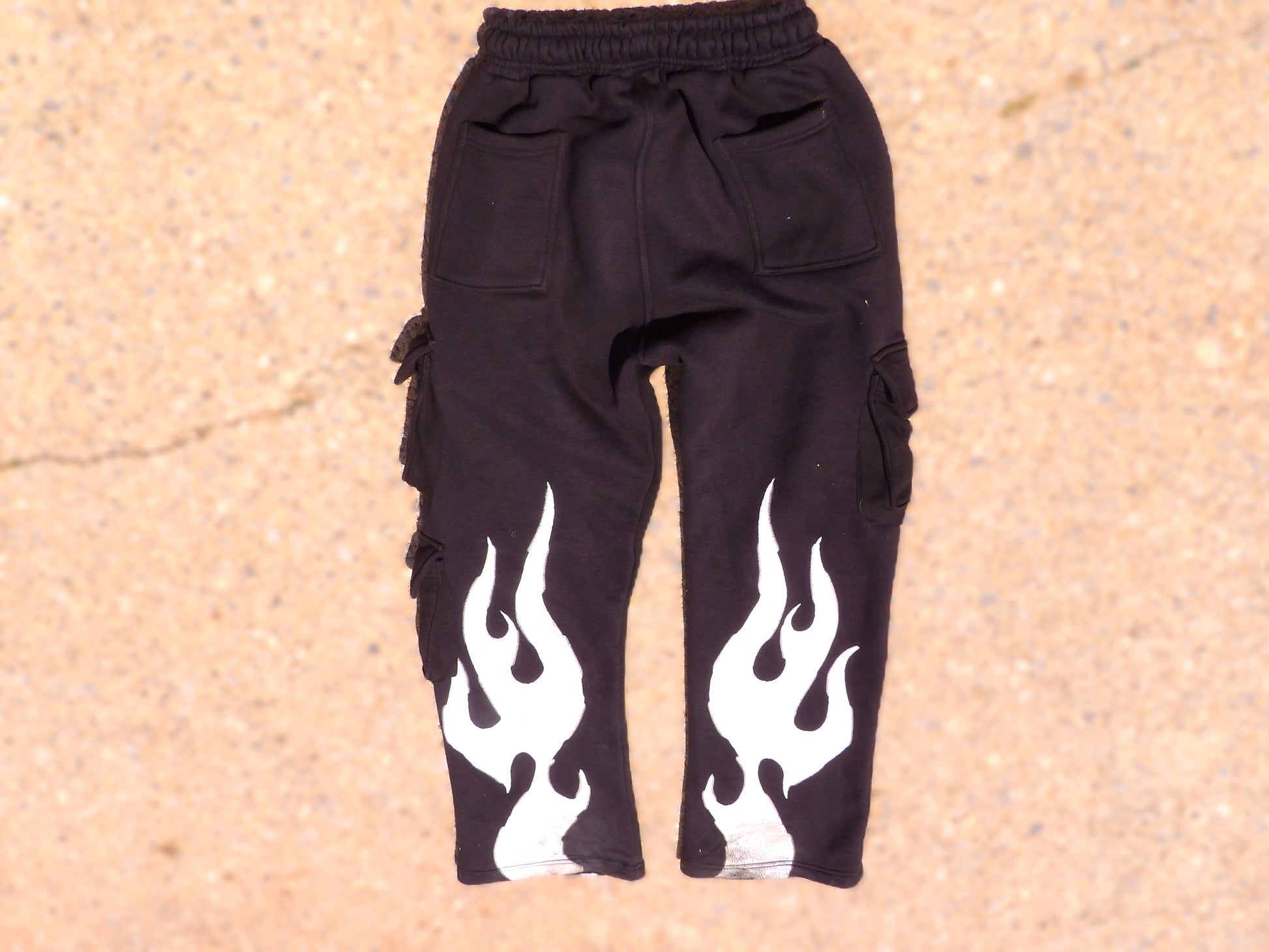 Graphic pant deigned by Noir Prince, the fire on the legs of the pants can be seen as a metaphor, "the wearer is stepping over adversity."